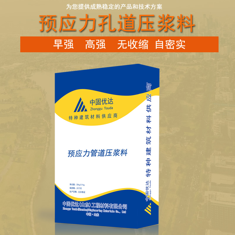 预应力管道压浆料简称压浆料,是由优质水泥基材料、减水剂、微膨胀剂、矿物掺合料配制而成,具有良好的流动性,不泌水,不离析,无收缩、微膨胀,强度高,抗渗抗冻、抗腐蚀、粘接度高、绿色环保等特点,不含氧化物、氯化物、亚硫酸盐和亚硝酸盐等对钢筋有害组份,产品广泛应用于铁路桥梁、公路桥梁、核电站等大型工程的预应力结构孔道灌浆的施工;各种砼结构接头处止漏灌浆;空隙填补或修复;地面锚固压浆、设备基础压浆、底板注浆、梁柱节点、工程抢修等用途。